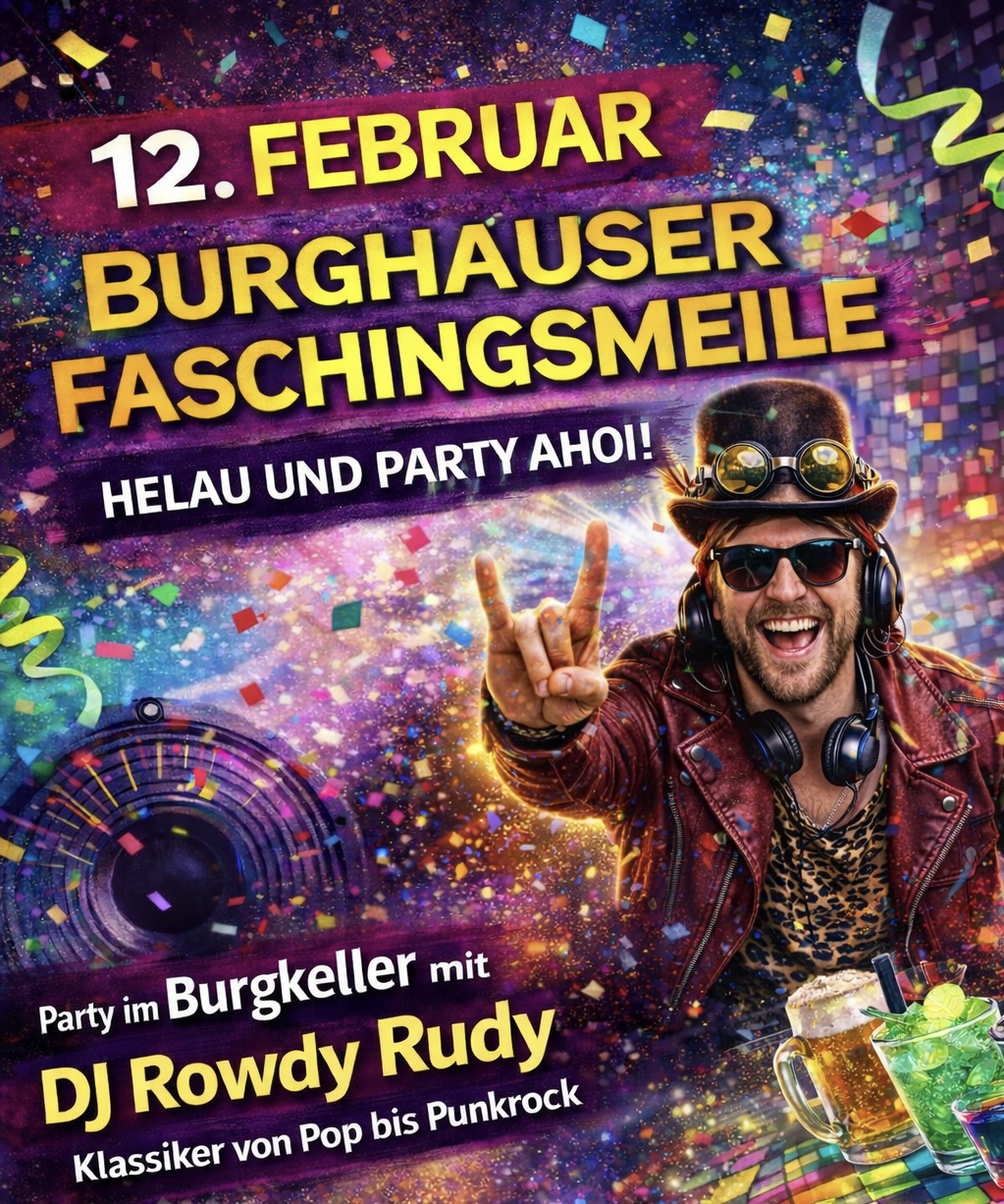 BurgkellerbarHelau und Party ahoi! Die Burghauser Faschingsmeile ist zurück – und der Burgkeller mittendrin! Macht Euch bereit für die längste und bunteste Faschingsnacht Süd-Ost Bayerns: Tanzen, Flirten, Feiern – und das alles mitten in der Altstadt. Bei uns legt DJ Rowdy Rudy die fettesten Klassiker auf – von Pop bis Punkrock – und sorgt dafür,... Artikel ansehen